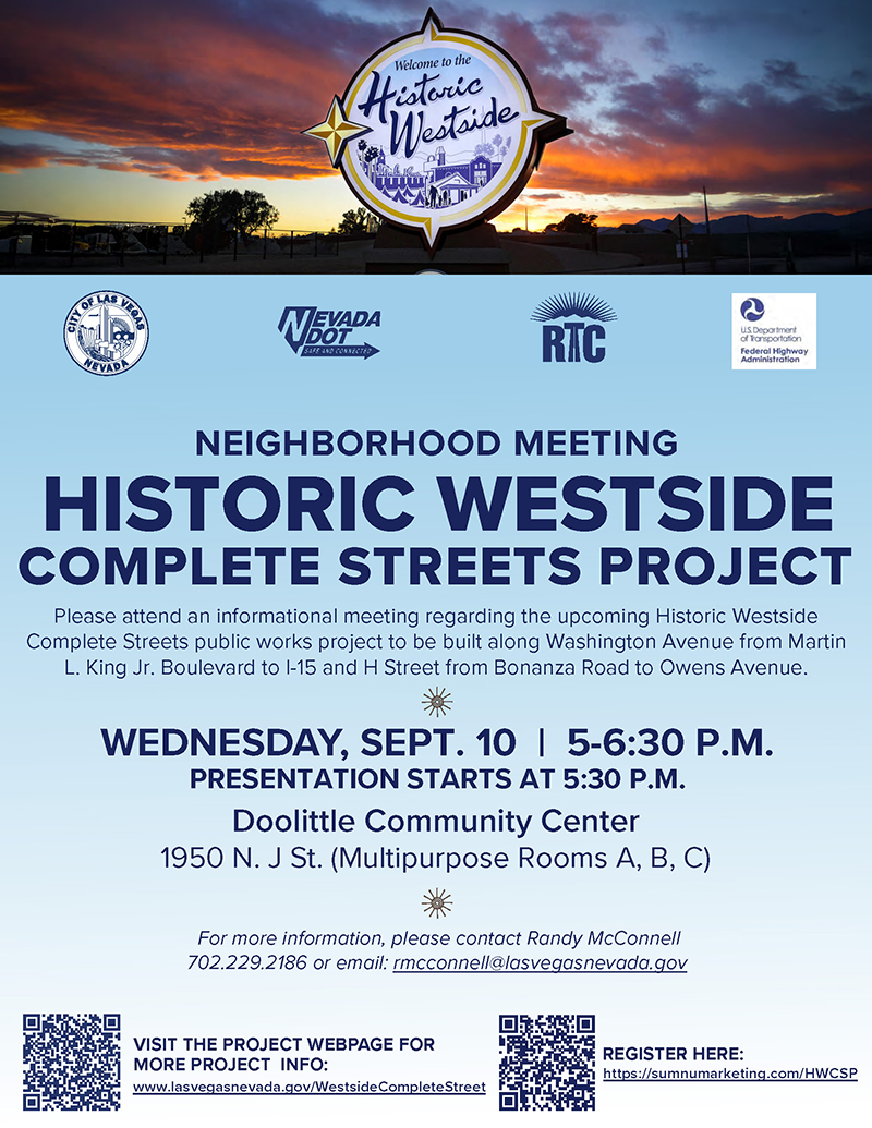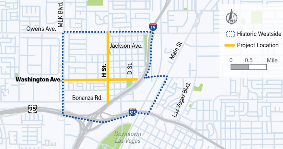 The project is located in the Historic Westside neighborhood. The proposed improvements along Washington Avenue are from Martin Luther King Boulevard to I-15 and along H Street from Bonanza Road to Owens Avenue.